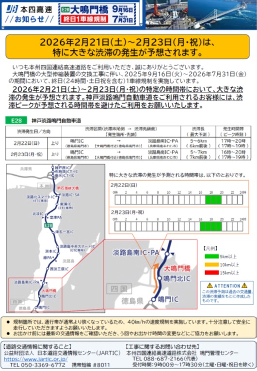 2026年2月21日~2月23日大鳴門橋工事による渋滞予想